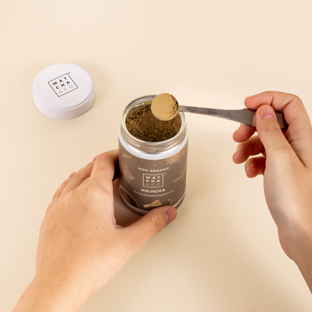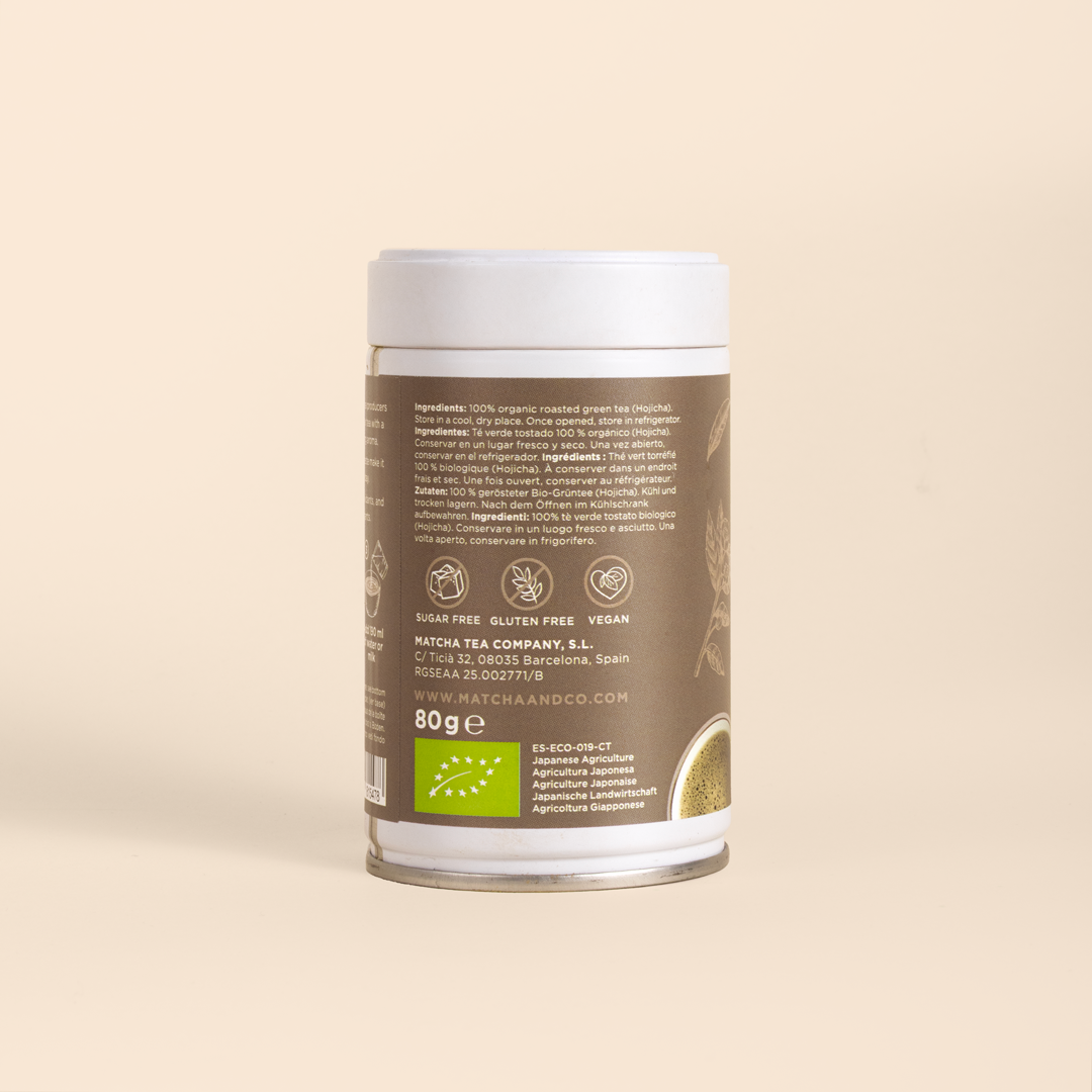 Organic Hojicha tea powder from Japan with a natural smoky flavor. Rich in antioxidants, it provides gentle energy and well-being without added sugars, colors, or preservatives.