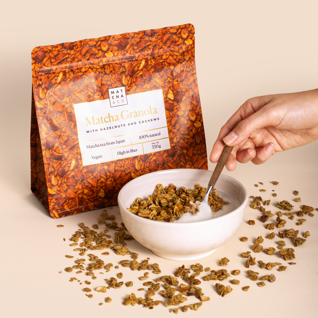 The recommended matcha dose per serving is 1 g. This granola contains 1% matcha, so a standard 30 g serving includes 0.3 g of matcha and is perfectly healthy. You can even enjoy a second serving!