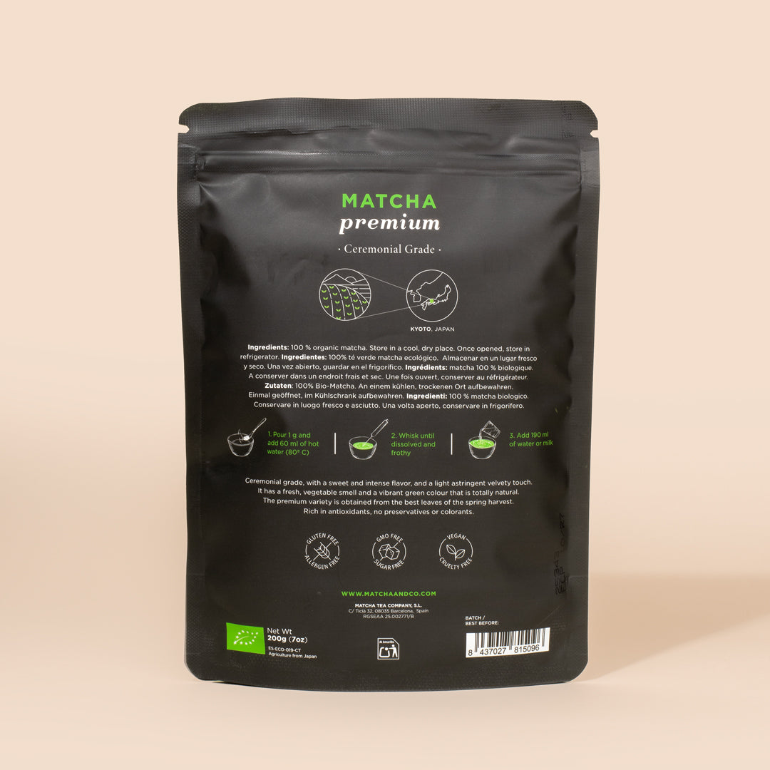 Premium Matcha tea contains caffeine and L-Theanine, ideal to drink at morning or noon to improve concentration and performance.